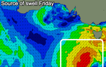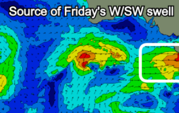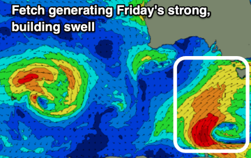 A new fetch developed around the associated polar low today, and it’s better aligned within our swell window, and will provide fun waves building Thursday, before easing a touch into Friday.